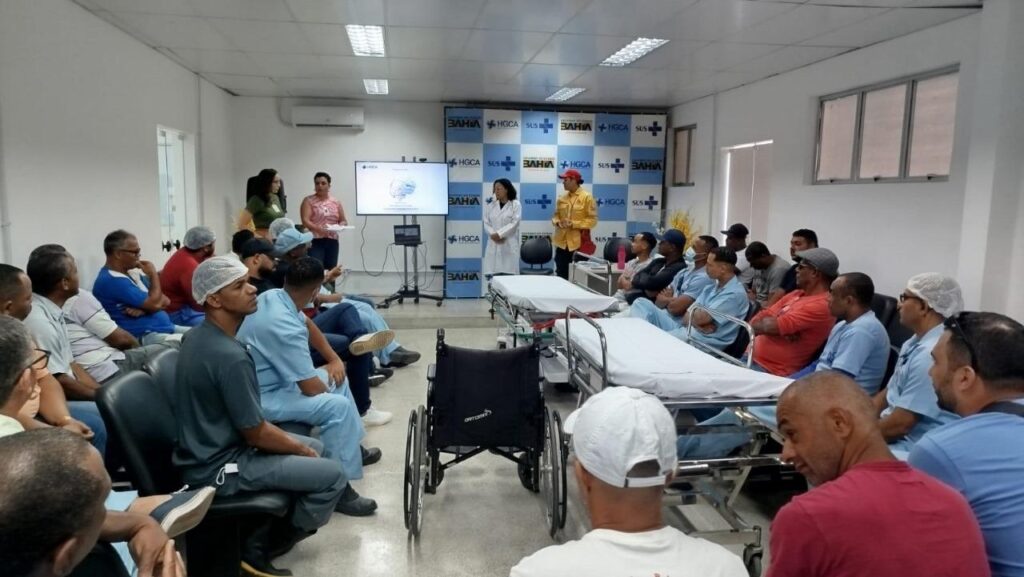 Na manhã desta segunda-feira (26), o Hospital Geral Clériston Andrade (HGCA) promoveu uma capacitação voltada para a equipe de maqueiros, com o objetivo de aprimorar o transporte seguro de pacientes e a identificação rápida de sintomas de Acidente Vascular Cerebral (AVC), garantindo o atendimento dentro da janela terapêutica de 4h30. O treinamento, organizado pela Coordenação de Apoio Administrativo do HGCA em parceria com o Centro de Ensino, Pesquisa e Extensão em Saúde (CEPER), contou com a presença do Núcleo de Segurança do Paciente, Dra. Renata Nunes, médica coordenadora de Neurologia, e de Keliane Pinto, enfermeira do Corpo de Bombeiros Civil.