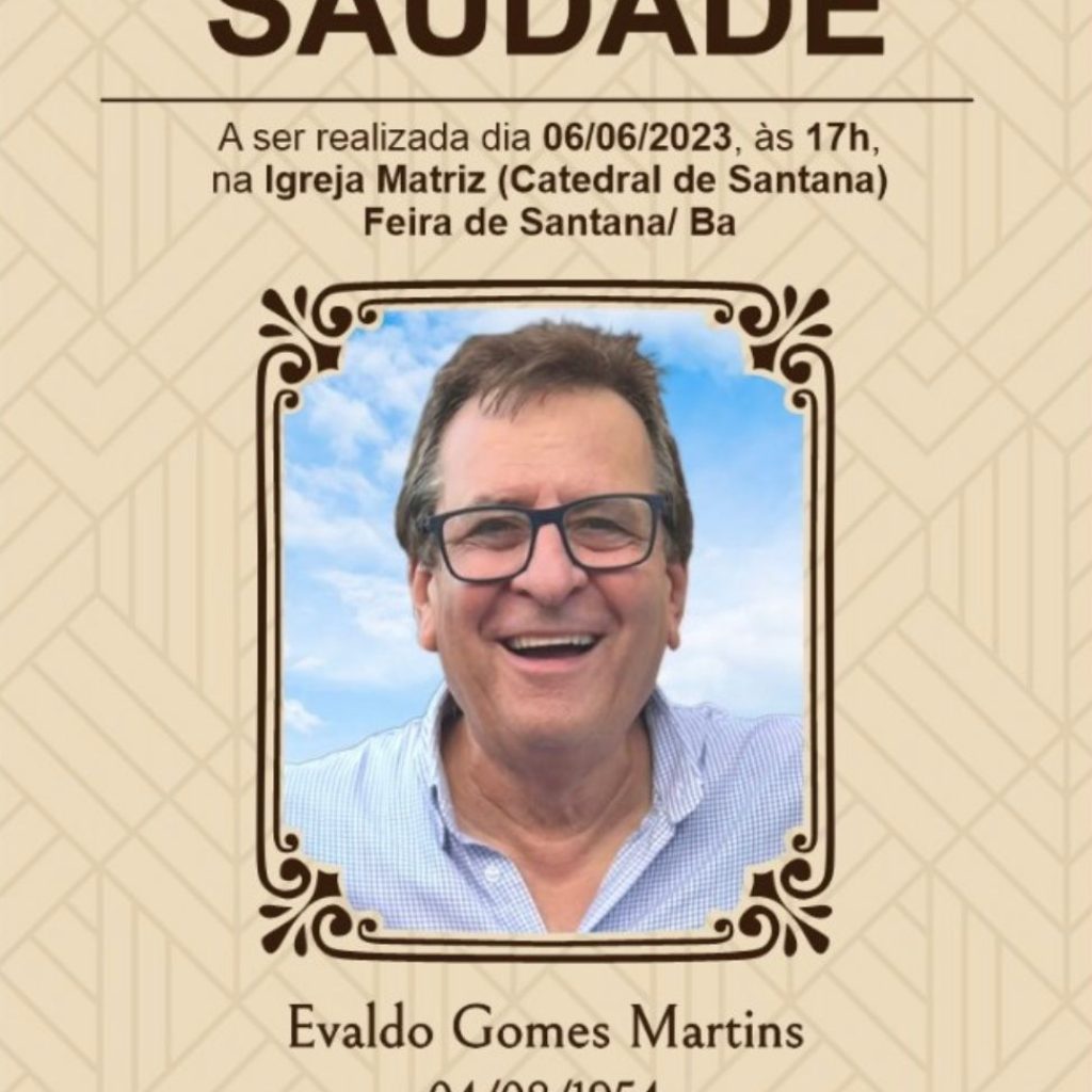 Será celebrada nesta terça-feira (06), às 17h, na Igreja da Matriz (Categdral de Senhora Santana) a Missa da Saudade em homenagem a Evaldo Gomes Martins, que faleceu no dia 7 de maio. Irmão do prefeito de Feira de Santana, Colbert Martins Filho, Evaldo era economista, empresário e pecuarista bastante conhecido em todo o país.