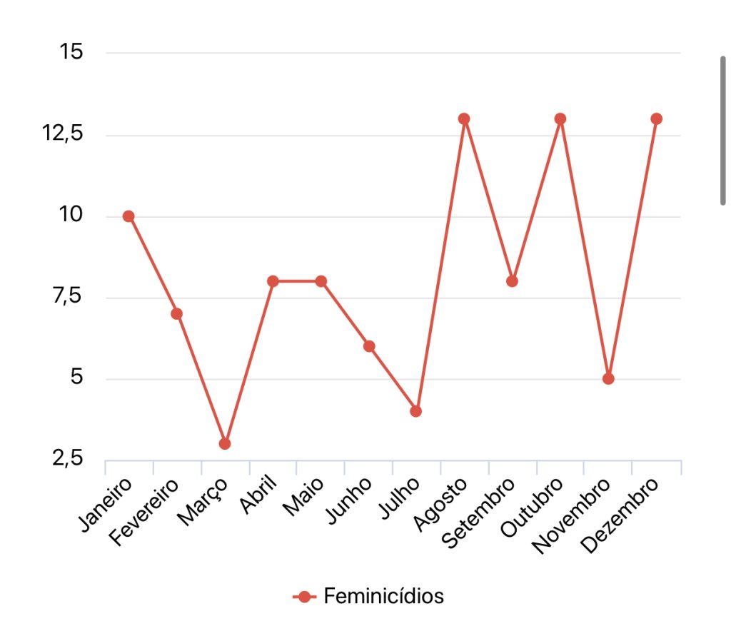 Agosto, outubro e dezembro foram os meses com maior contabilização de feminicídios. Um dos crimes, inclusive, foi cometido por um agente da Segurança Pública: um policial militar. Greice Kelly Rocha Soares foi morta com tamanha brutalidade, que além de oito tiros também foi esfaqueada.