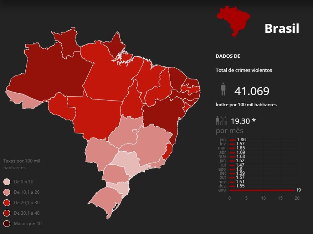 Veja a escala de taxa de assassinatos por 100 mil habitantes por estado — Foto: Luisa Rivas/g1