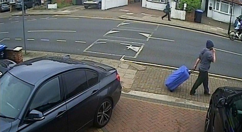 Imagens feitas por uma câmera de rua mostram a promotora imobiliária arrastando uma mala contendo o corpo da vítima, junto com uma segunda mala contendo documentos financeiros, por Londres durante duas horas.