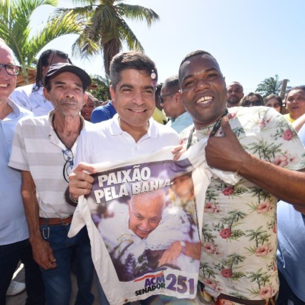 O candidato participou de um comício na cidade de Milagres na noite de sábado (02), onde foi presenteado pelo prefeito Cezar de Aderio (PP) com uma camisa com o mapa da Bahia e os dizeres da tradicional música “ACM, meu amor”, escrita em 1990 para a campanha de seu avô ao Governo do Estado. Neto não escondeu a emoção.