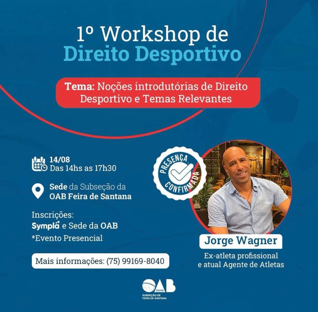 “Através deste workshop, a comissão pretende inaugurar uma série de encontros dedicados a essa área tão promissora do Direito, e tem como objetivo proporcionar uma introdução aos princípios e fundamentos do Direito Desportivo. Parabenizo todos os envolvidos neste projeto pela organização e por abarcar um tema tão interessante em nossa área jurídica”, declara Raphael Pitombo, presidente da OAB Feira e um dos palestrantes convidados para o evento.