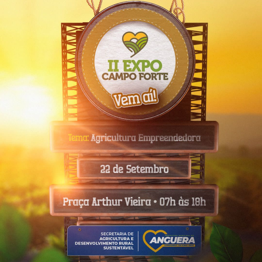 A Prefeitura Municipal de Anguera, através da Secretaria de Agricultura e Desenvolvimento Rural e Sustentável lançou a II Expo Campo Forte, que acontecerá na Praça Arthur Vieira, no dia 22 de setembro das 07h às 18h. O evento tem como objetivo valorizar a agricultura, artesanato e a agropecuária locais e abrir um espaço de socialização entre produtores, população e visitantes, onde poderão conhecer com mais afinco os produtos que são oferecidos no município.