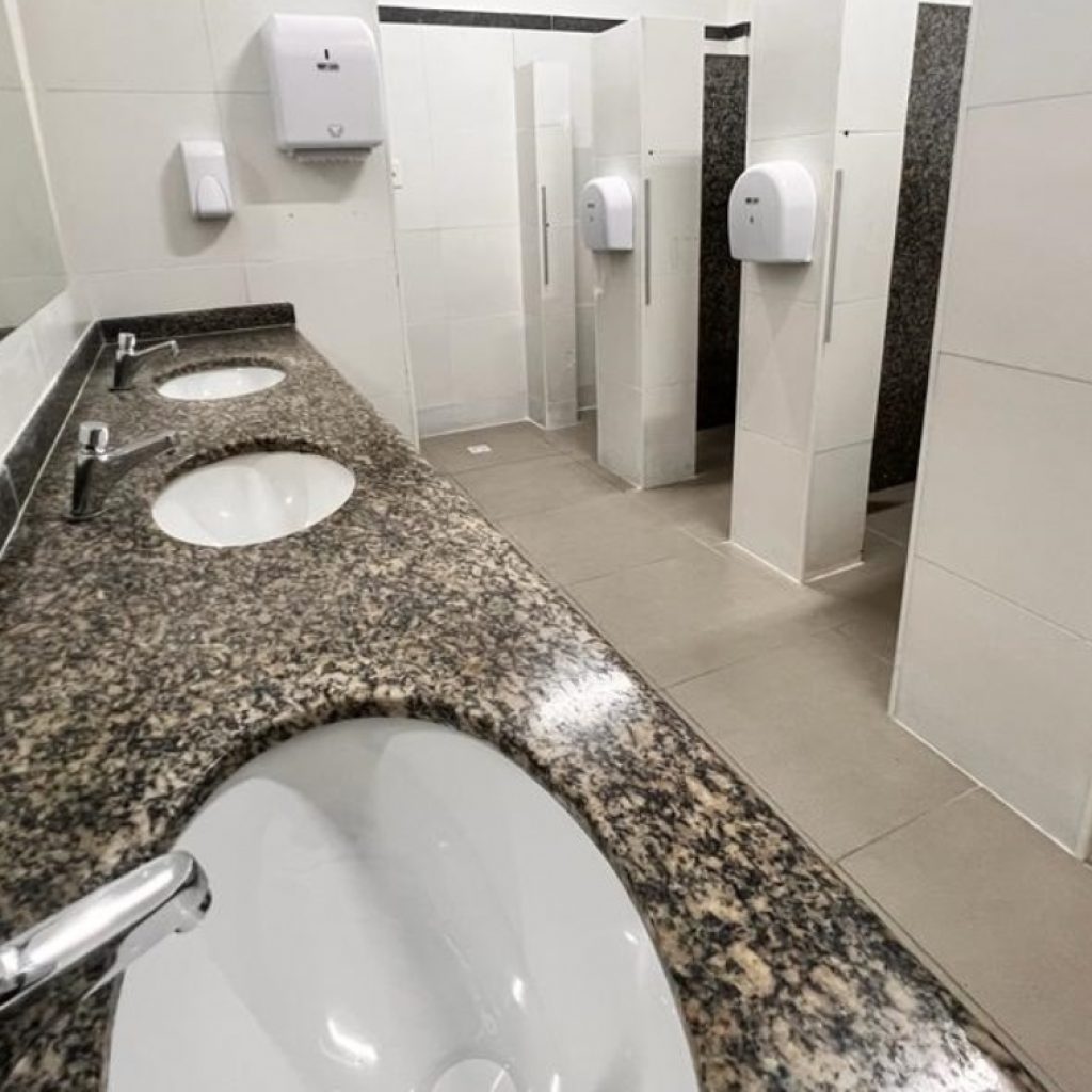 Os serviços compreendem a aplicação de revestimento para ambientes de alta rotatividade, instalação de portas metálicas, substituição de vaso sanitário e acessórios, nova iluminação em LED com sensor de presença e revisão das instalações elétrica e hidráulica.