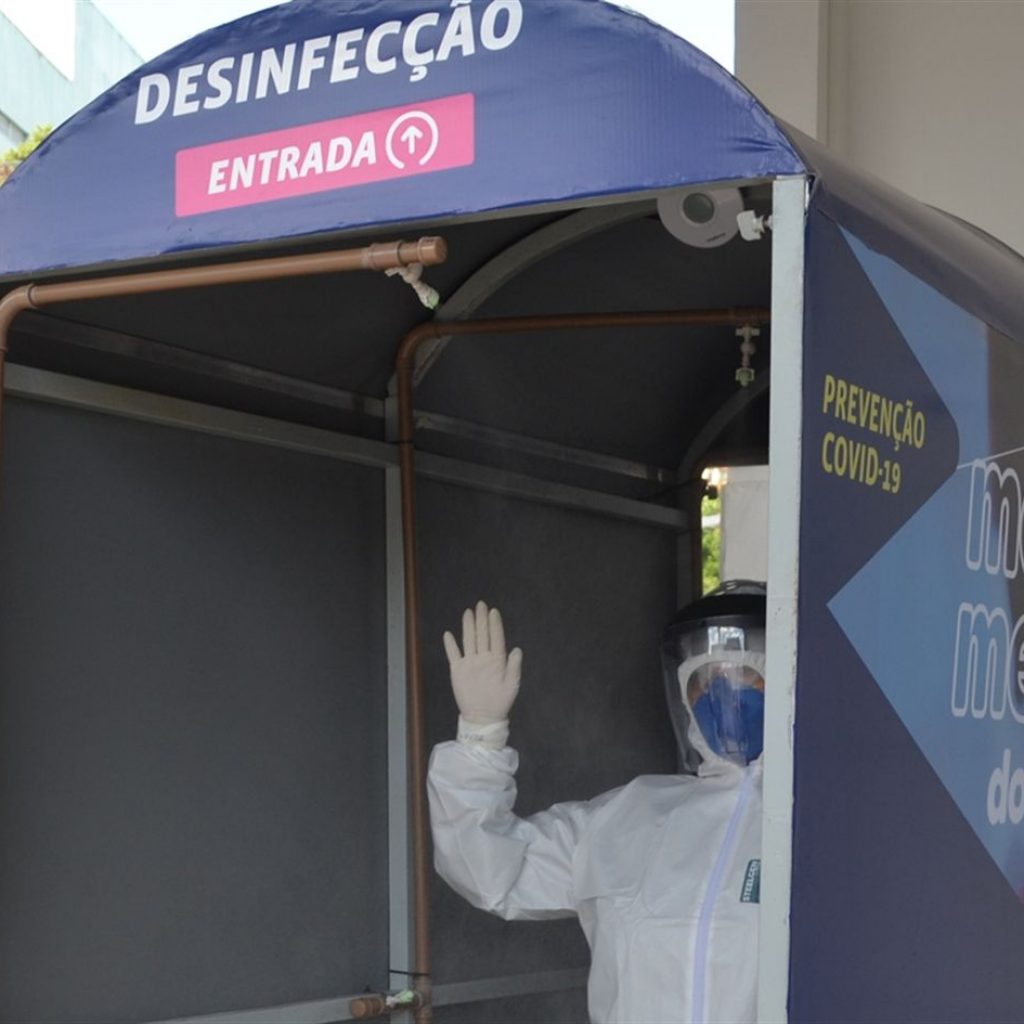 O túnel de desinfecção funcionará para os profissionais que retornarem aos atendimentos relacionados aos casos suspeitos ou confirmados da Covid-19, ainda com os equipamentos.