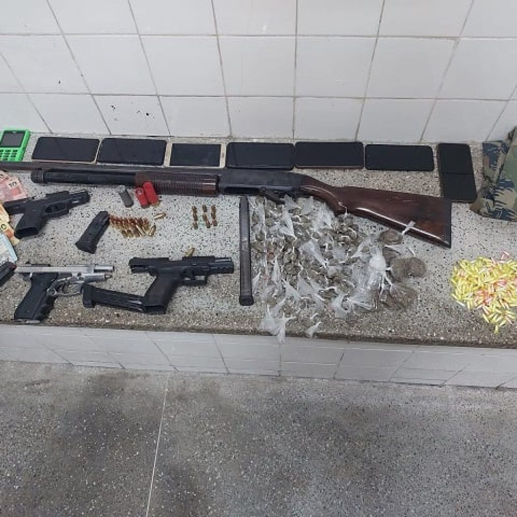 Com os criminosos foram localizados uma espingarda calibre 12, três pistolas, quatro carregadores, 35 munições, 244 porções de cocaína, 196 porções de maconha, crack, mais de R$ 4 mil, duas máquinas para cartão de crédito, sete celulares, embalagens para entorpecentes e um caderno com anotações do tráfico de entorpecentes.
