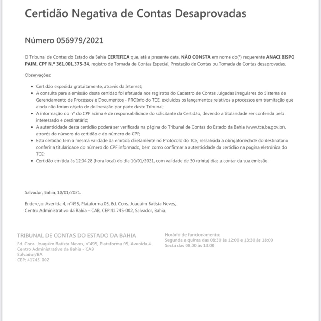 Não há qualquer irregularidade referente à prestação de contas em nome da professora Anaci Bispo Paim, secretária municipal de Educação, conforme certidão emitida pelo Tribunal de Contas do Estado da Bahia no último dia 10 de janeiro.