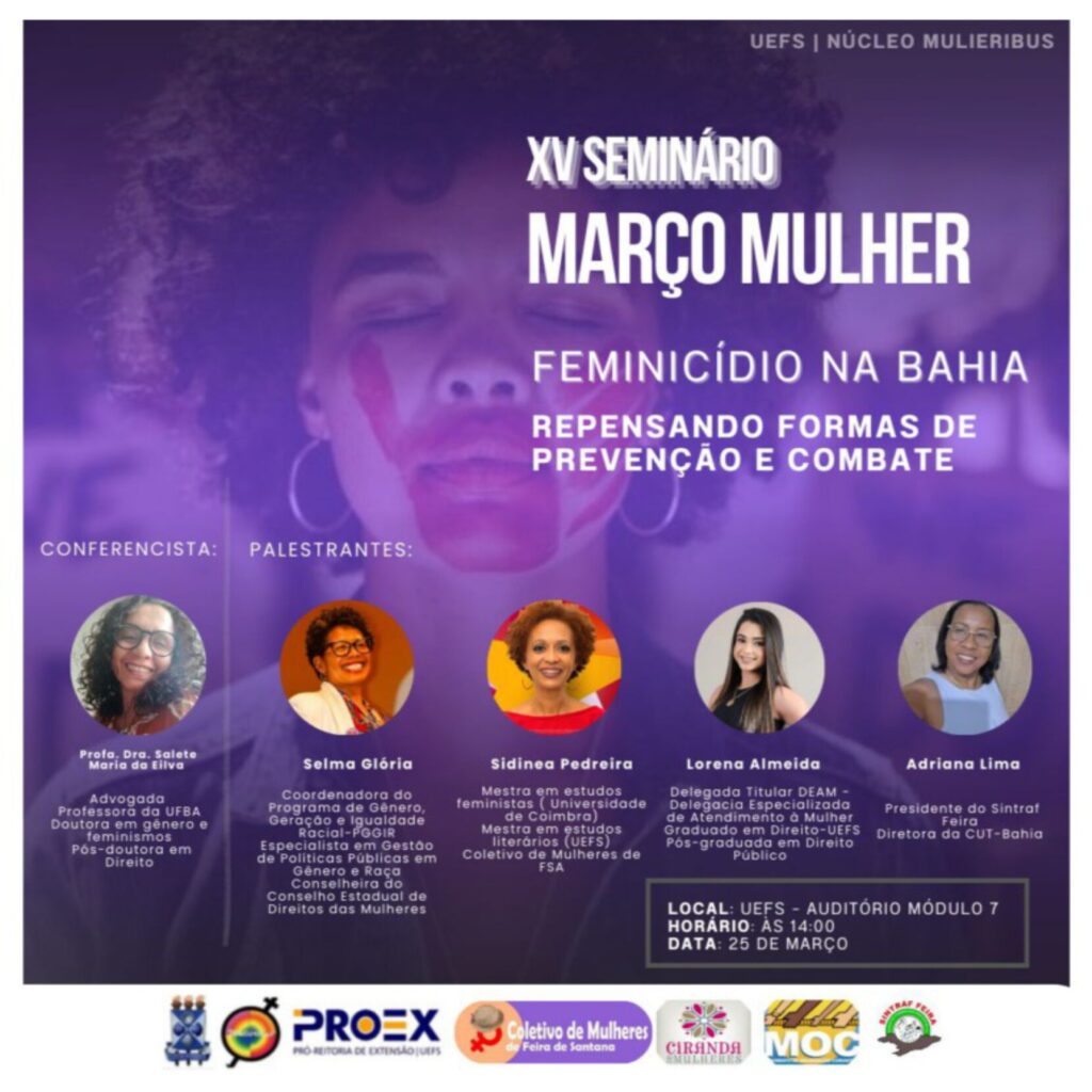 Visando fortalecer o debate público sobre a violência contra as mulheres e discutir caminhos para o aprimoramento das políticas públicas de proteção, a Universidade Estadual de Feira de Santana (Uefs), por meio do Núcleo de Estudos Interdisciplinares sobre Mulheres e Relações de Gênero (Mulieribus), em parceria com o Coletivo de Mulheres de Feira de Santana (Comu) e organizações da sociedade civil, promove, no dia 25 de março, às 14h, no Auditório do Módulo 7 da Uefs, o 15º Seminário Março Mulher.