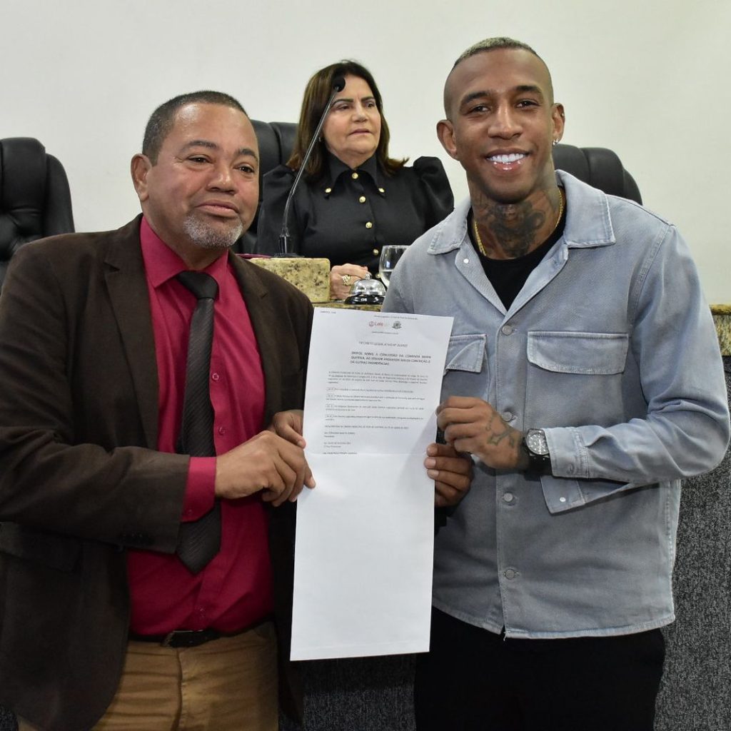 O novo comendador relatou na Tribuna da Câmara um pouco sobre seu histórico de dificuldades antes de alcançar sucesso na carreira de futebolista e dirigiu uma palavra de motivação a quem está lutando para vencer na vida. “Digo a todos os jovens que não desistam de seus sonhos”. Ressaltou a importância e o forte impacto das boas amizades e do apoio familiar em sua vida. “O mais importante de tudo isso é que eu cheguei aqui por causa do povo feirense. Não tem como separar o êxito de minha carreira do carinho da população de Feira”, disse, em reconhecimento à cidade, “de modo muito especial”.