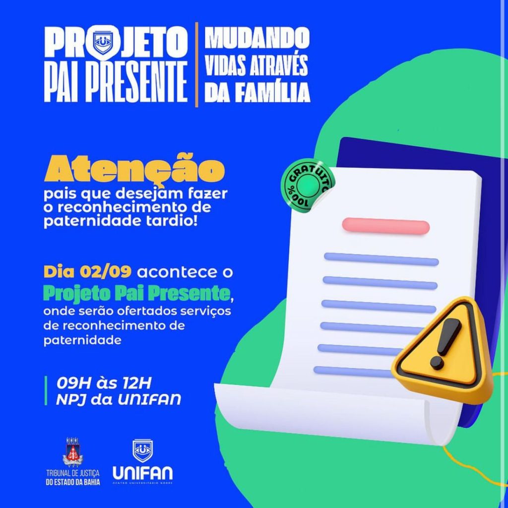 No dia 02 de setembro, das 09h às 12h, a UNIFAN em uma iniciativa parceira com o Conselho Nacional de Justiça: o Projeto Pai Presente. Este evento revolucionário visa promover o reconhecimento de paternidade de maneira gratuita e simplificada, eliminando a necessidade de procedimentos processuais complexos.