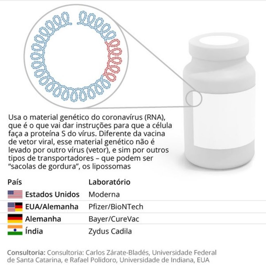 Nos infográficos mais abaixo, você pode ver, por tecnologia (plataforma), as principais vacinas que estão sendo aplicadas no mundo hoje ou que estão na última fase de testes em humanos (a fase 3).