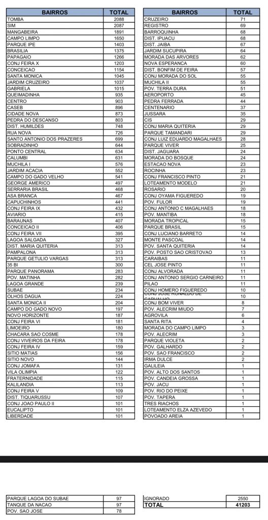 A Prefeitura de Feira de Santana, através da Divisão de Vigilância Epidemiológica da Secretaria Municipal de Saúde, divulgou nesta sexta-feira (04) a relação atualizada do número de casos de Covid-19 por bairros e localidades. O Tomba é o bairro com o maior número, com 2.088 casos confirmados.